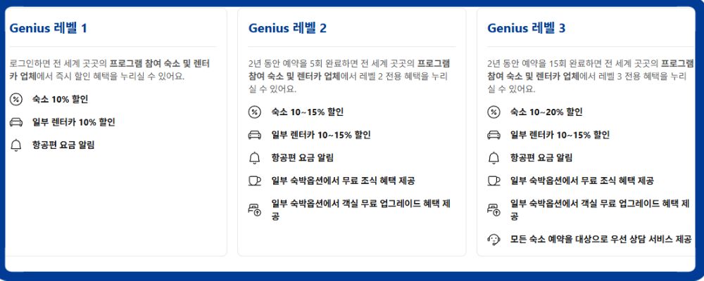 | Genius 레벨 | 기본 숙소 할인 | 대표 혜택 요약 |