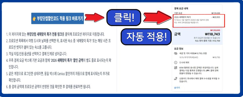 새해맞이 특가 등 프로모션 요금과 Genius 할인은 서로 다른 레이어로 작동하는 경우가 많아서, 두 혜택이 동시에 적용되는지 최종 결제 화면에서 할인 내역이 몇 줄로 나오는지 확인하는 것이 좋습니다.