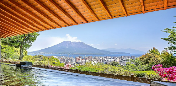 위치: 사쿠라지마가 한눈에 보이는 명소, 셔틀버스로 차량 없이도 편리하게 이동 가능.
